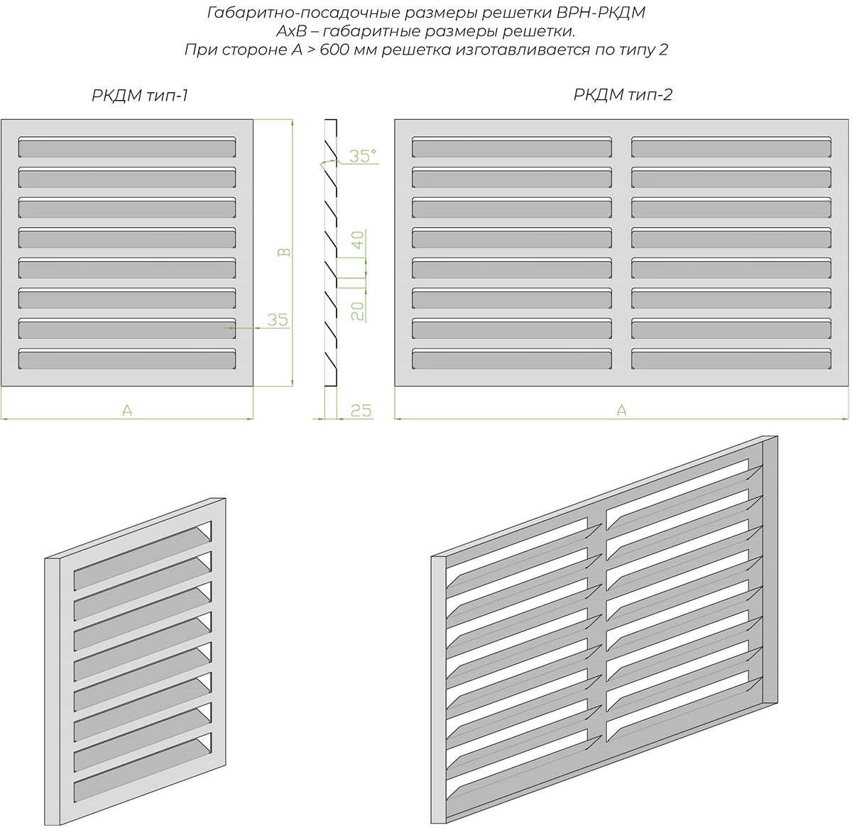 Решетка имеет накладной тип исполнения. Ламели отогнуты во внутрь на 35°, способствуя прохождению газа и дыма, и в то же время скрывая внутренние элементы конструкции клапана. Определяющими размерами (АхВ) при заказе являются габаритные размеры решетки.