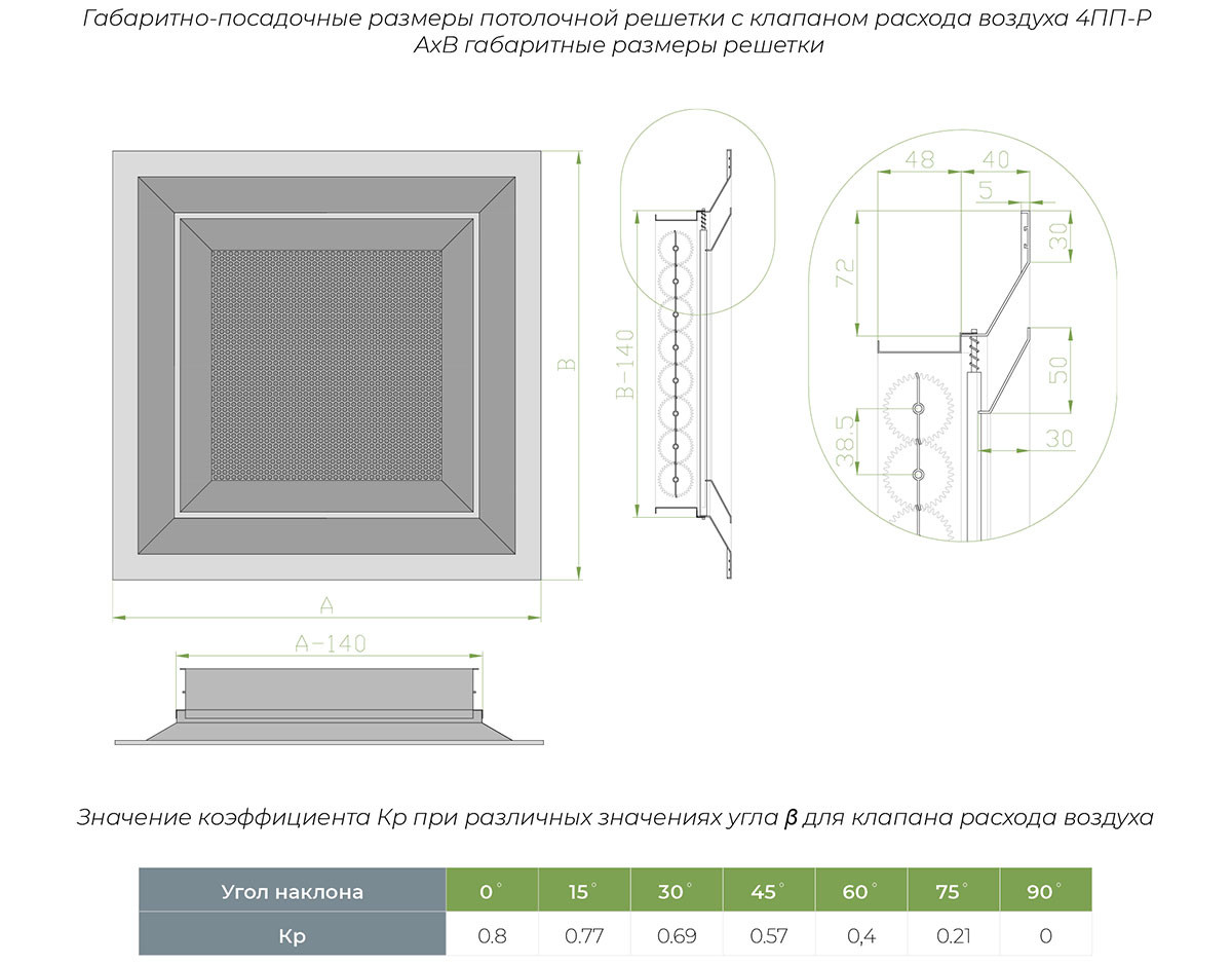 Потолочная решетка 4ПП-Р предназначена для распределения воздушного потока внутри помещения в одну сторону и регулирования объема поступающего в помещение воздуха. Следуя из названия потолочные решетки устанавливаются в основном в потолок, как правило, типа Армстронг, размеры решетки соответствуют размеру потолочной ячейки.