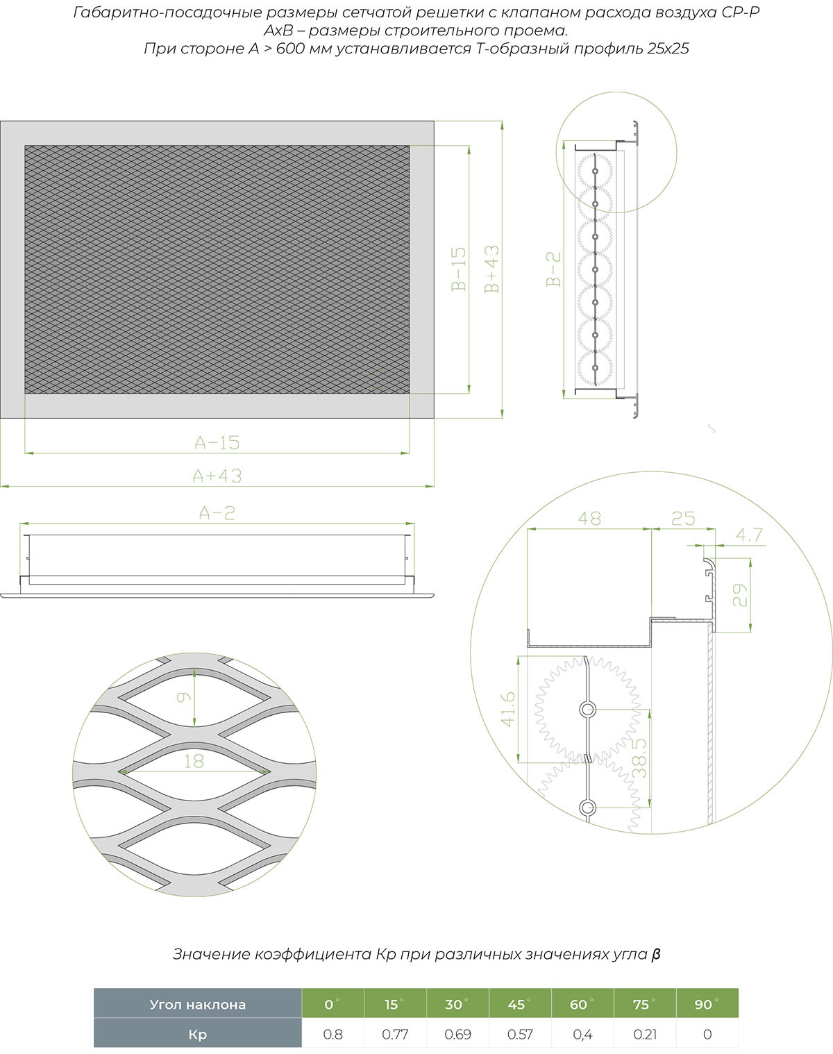 Сетчатые решетки с клапаном расхода воздуха СВР-Р используются в приточно-вытяжной вентиляции, различных системах воздуховодов, кондиционирования воздуха и предназначены для монтажа в воздуховоды или строительные проемы в помещениях различного типа и назначения. Решетки СВР-Р изготовлены из алюминиевого профиля в виде рамки и сетчатой вставки из оцинкованной стали. По умолчанию устанавливается просечно-вытяжная сетка 18х9 мм, по запросу возможно изготовление решеток с сеткой 10х10 мм.