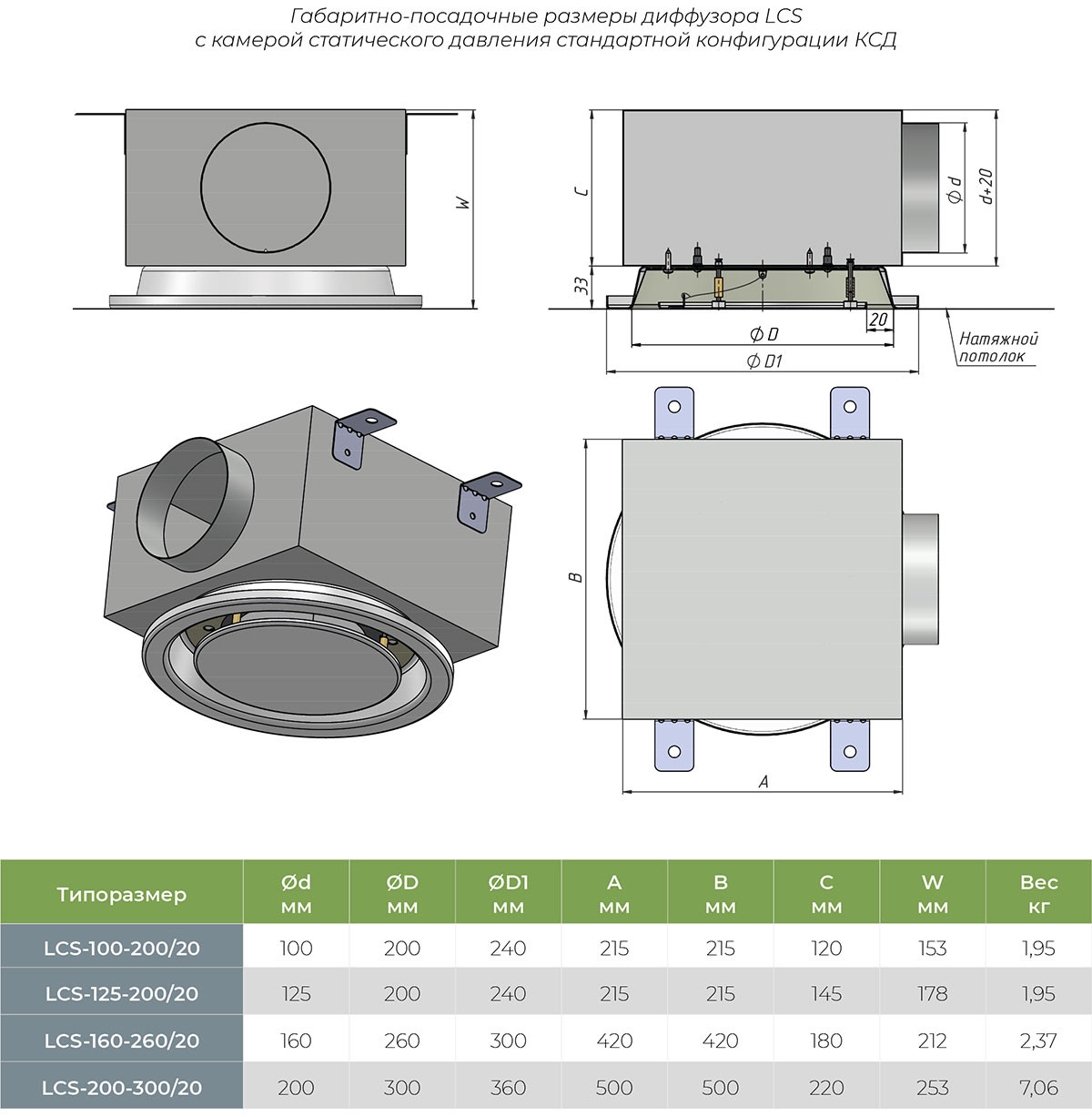 • Адаптер (КСД) для подключения к воздуховоду поставляется в сборе с диффузором. Специально разработанная конструкция позволяет добиться минимального занижения натяжных потолков до 90 мм.
